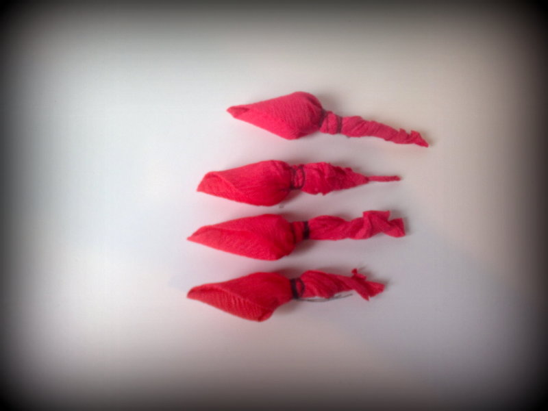 Teraz czas na pączki. Wycinamy mały prostokątny kawałek krepy i rozciągamy go.